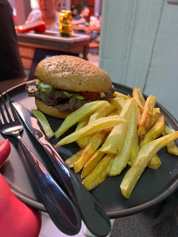 Pan tipo Brioche con Carne de vacuno, rodajas de tomate fresco, palta y salsas a elección. Más porción de papas fritas naturales.